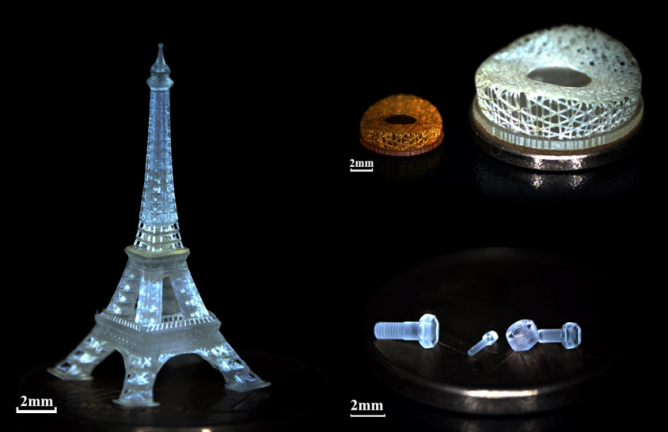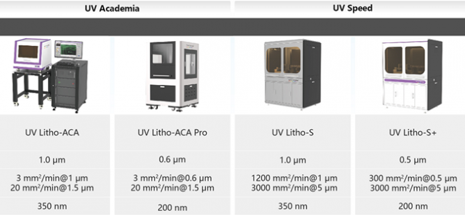 3D光刻的速度主要取決于單個(gè)切片光刻所需的速度與切片層數(shù)。采用高亮度LED光源,甚至是高亮度激光光源,結(jié)合高品質(zhì)的光學(xué)系統(tǒng),單層切片光刻速度得以達(dá)到領(lǐng)先水平,同一臺(tái)設(shè)備,可實(shí)現(xiàn)1 μm, 2 μm, 5 μm, 10 μm, 20 μm 的多種加工精度。