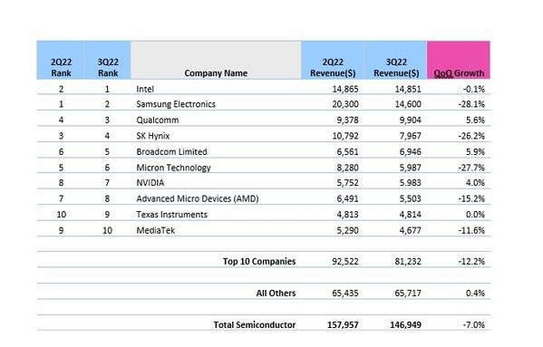 三家專注于內(nèi)存的公司(三星電子、SK海力士和美光科技)的排名都下降了一位。雖然主要的內(nèi)存供應(yīng)商占了2022年第三季度半導(dǎo)體收入下降超過100億美元,但他們并不是唯一掙扎的公司。由于個(gè)人電腦需求的放緩和庫(kù)存的減少,AMD的收入下降,這與英特爾在上一季度感受到的市場(chǎng)情況相同。