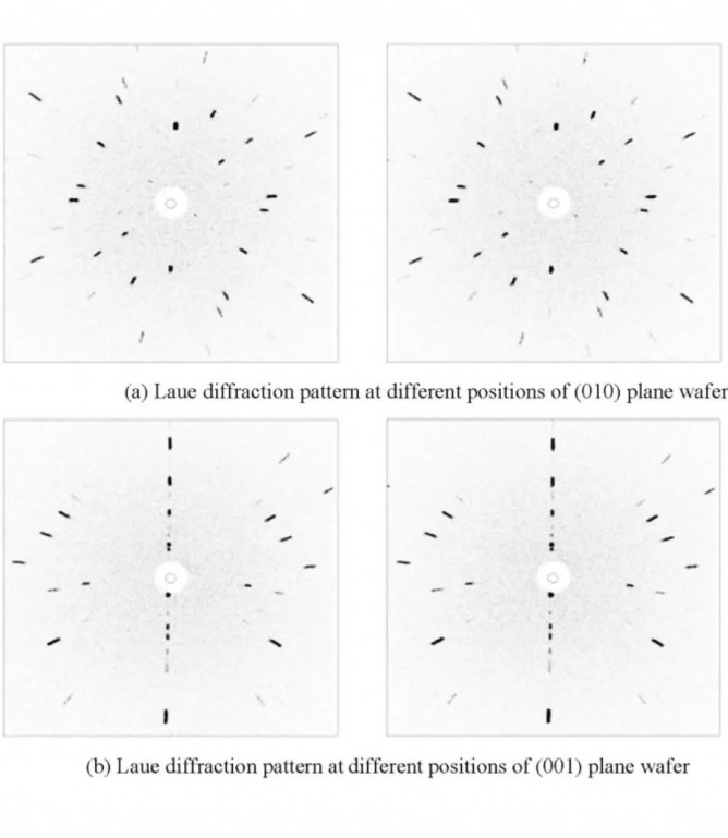 作為超寬禁帶半導(dǎo)體材料,氧化鎵禁帶寬度約4.8 eV、擊穿場強(qiáng)8 MV/cm、紫外截止邊約260 nm,同 時(shí)可采用熔體法低成本制備,成為寬禁帶半導(dǎo)體領(lǐng)域的研究熱點(diǎn)[1-3]。氧化鎵可用于制備功率器件、紫外探 測器、高能射線探測器,同時(shí)也可作為GaN、ZnO等半導(dǎo)體的襯底材料使用[4]。由于超高的擊穿場強(qiáng)和巴 利加優(yōu)值,氧化鎵功率器件具有耐壓高、導(dǎo)通損耗低、開關(guān)速度快的優(yōu)點(diǎn)。目前,氧化鎵二極管及場效應(yīng) 晶體管器件耐壓均可達(dá)幾千伏,器件擊穿場強(qiáng)已超過SiC和GaN的理論極限[1]。β-Ga2O3 結(jié)構(gòu)是熱力學(xué)最穩(wěn)定的結(jié)構(gòu),屬于單斜晶系,空間群為C2/m,其晶格常數(shù):a=1.221 nm,b=0.303 nm,c=0.579 nm,a與c的夾角約為103.8°[5]。由于β-Ga2O3 是熱力學(xué)穩(wěn)定相,通過熔體只能生長β-Ga2O3晶體。β-Ga2O3 晶體常用生長方法為光學(xué)浮區(qū)法、導(dǎo)模法、提拉法、布里奇曼法等[6-8]。不同晶體生長方法 各有特點(diǎn),目前導(dǎo)模法和提拉法較為成熟,并且可以制備出2英寸(1英寸=2.54 cm)及以上單晶。由于 導(dǎo)電晶體具有較強(qiáng)自吸收的特性,提拉法晶體生長過程中界面控制難度較大,導(dǎo)致一般提拉法只能生長高阻β-Ga2O3 晶體[9]。導(dǎo)模法則既可生長高阻晶體也可生長導(dǎo)電晶體,是目前產(chǎn)品化襯底的主要制備方法。在單晶制備方面,日本Novel Crystal Technology目前已通過導(dǎo)模法實(shí)現(xiàn)了2~6英寸片狀晶體的生長[10]。德 國萊布尼茲晶體生長研究所、美國空軍實(shí)驗(yàn)室及Northrop Grumman公司也通過提拉法生長獲得了高阻2 英寸晶體[1,11]。 本文通過導(dǎo)模法制備了4英寸β-Ga2O3單晶,晶體外形完整,通過勞厄衍射、高分辨X射線搖擺曲線 分析確認(rèn)晶體結(jié)晶質(zhì)量較高。采用濕法刻蝕的方法,研究了晶體腐蝕特性及位錯密度。通過C-V測試,確 認(rèn)了晶體電子濃度。 晶體生長使用的原料為氧化鎵粉末,純度99.999%,采用中頻感應(yīng)加熱,銥金發(fā)熱體、銥金模具,銥 金坩堝周圍放置氧化鋯作為保溫材料。采用<010>方向籽晶,晶體最大主面為(001)面,模具寬度為105 mm。氧化鎵粉末加熱熔化后,熔體會通過毛細(xì)作用上升到模具表面,通過籽晶誘導(dǎo)作用不斷提拉長大。圖1為 導(dǎo)模法生長4英寸β-Ga2O3 晶體。 Fig.1 Photograph of 4-inch β-Ga2O3 crystal 濕法化學(xué)腐蝕使用質(zhì)量分?jǐn)?shù)為30%的KOH溶液,溫度為110 ℃,腐蝕時(shí)間90 min。 掃描電子顯微鏡(SEM)圖像使用FEI公司的Nova NanoSEM450掃描電子顯微鏡進(jìn)行測試,電子束流強(qiáng) 度為0.6 pA~200 nA,著陸電壓為50 V~20 kV。 原子力顯微鏡(AFM)圖像使用Bruker公司的Bioscope Resolve型原子力顯微鏡,可實(shí)現(xiàn)快速掃描,掃描 速度不低于70 Hz。 高分辨X射線衍射設(shè)備來自Bruker AXS公司,型號為D8 Discover,靶材為Cu Kα1,波長λ為0.154056 nm。 勞厄衍射斑點(diǎn)圖使用Multiwire Laboratories公司的MWL 120型X射線勞厄衍射儀,X射線靶為鎢靶,光源焦斑尺寸小于0.5 mm×0.5 mm。 紫外光譜使用PerkinElmer Lambda950型紫外-可見-近紅外分析光度計(jì)進(jìn)行測試,測試的波長范圍為 200~400 nm。 使用HHV auto 500電子束蒸發(fā)鍍膜系統(tǒng)在β-Ga2O3 (100)制備肖特基接觸Pt/Au(50 nm/50 nm)和歐姆接 觸Ti/Au(50 nm/50 nm)的垂直結(jié)構(gòu)電極,其中圓點(diǎn)肖特基電極的直徑為360 μm。C-V測試使用Keysight B1500 fA級半導(dǎo)體參數(shù)測試系統(tǒng)進(jìn)行測試,測試頻率為1 MHz。 為評估晶體質(zhì)量,采用X射線勞厄衍射儀對晶體進(jìn)行勞厄測試。圖2為晶體(010)和(001)面不同位置 的勞厄衍射斑點(diǎn)圖。衍射斑點(diǎn)與β-Ga2O3 理論衍射斑點(diǎn)一致,衍射斑點(diǎn)清晰對稱,無重疊現(xiàn)象,并且同一 晶面不同位置的衍射斑點(diǎn)圖具有高度一致性,說明晶體具有良好的單晶性,無孿晶存在。Fig. 2 Laue diffraction pattern of the β-Ga2O3 single crystal