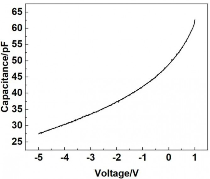 Fig. 4 X-ray rocking curve of β-Ga2O3 (400) plane 圖5為β-Ga2O3晶體C-V曲線圖,由公式可得β-Ga2O3 的載流子濃度為7.77×1016 cm- 3,其中S為電極接觸面積、εr為相對介電常數(shù)、ε 0 為真空介電常數(shù)、N為載流子濃度??梢钥闯龇枪室?摻雜晶體具有一定的載流子濃度,目前已有研究表明Si元素在β-Ga2O3 晶體中是很好的淺施主雜質(zhì)[12],并 且有研究人員利用雜化泛函計(jì)算出氧空位在晶體中以深能級的形式存在,其激活能高達(dá)1 eV,不能作為n 型背景電子的根本來源[13]。所以如今研究者普遍認(rèn)為雜質(zhì)是造成非故意摻雜襯底n型導(dǎo)電的原因。因此猜 測晶體中的施主可能來源于原料中的Si等n型雜質(zhì)離子。 Fig. 5 C-V curve of β-Ga2O3 crystal