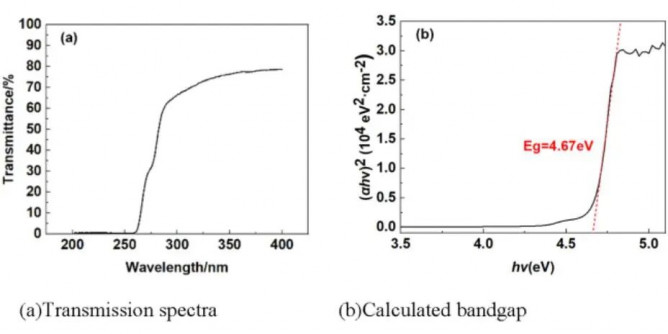 晶體的紫外透過光譜如圖6(a)所示,當(dāng)波長為λ的光入射到半導(dǎo)體表面時(shí),光激發(fā)產(chǎn)生電子-空穴對的 條件是,Eg為禁帶寬度、h為普朗克常量、c為光速,即半導(dǎo)體的禁帶寬度決定了材料的紫外截 止邊。β-Ga2O3 紫外截止邊為到262.1 nm,通過外推法得到晶體的禁帶寬度為4.67 eV,如圖6(b)所示。