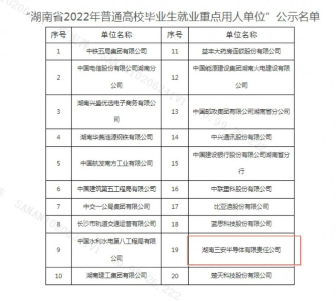 11月22日,湖南省“就業(yè)向未來 建功新時代”2023屆高校畢業(yè)生就業(yè)促進月系列活動啟動儀式在長沙學院舉行,副省長秦國文出席啟動儀式并講話。湖南三安獲評“湖南省2022年普通高校畢業(yè)生就業(yè)重點用人單位”,公司外聯(lián)部長費偉代表公司領(lǐng)獎。