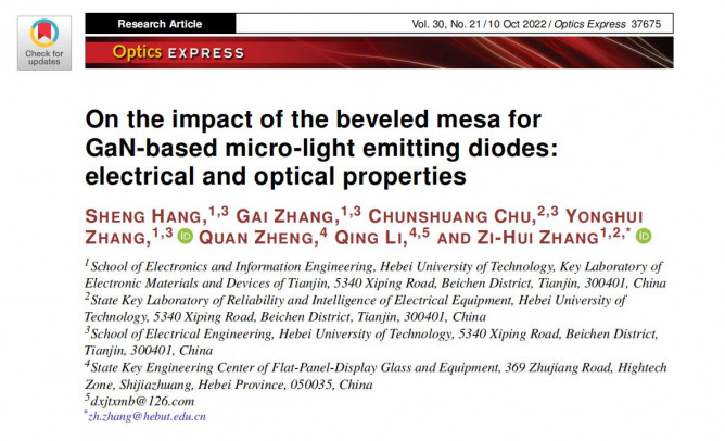 半導(dǎo)體產(chǎn)業(yè)網(wǎng)訊:近日,由河北工業(yè)大學(xué)張紫輝教授領(lǐng)銜的科研團(tuán)隊(duì)在具有傾斜臺(tái)面的GaN基Micro-LED方面獲得新進(jìn)展。并以“On the impact of the beveled mesa for GaN-based micro-light emitting diodes:electrical and optical properties”為題發(fā)表在應(yīng)用物理及光學(xué)領(lǐng)域權(quán)威SCI期刊《Optics Express》 (vol. 30, no. 21, pp. 37675-37685, 2022) 收錄,文章鏈接:https://doi.org/10.1364/OE.470703。