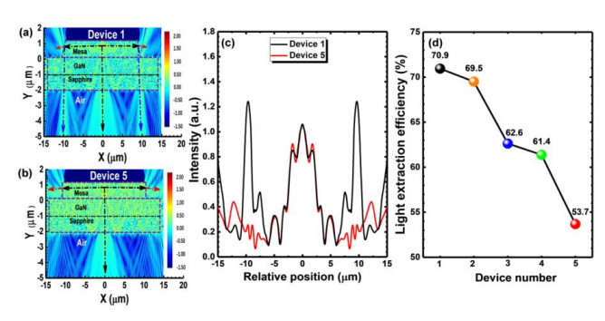 圖1 (a)Device 1和(b)Device 5的2D電場(chǎng)分布圖;(c)Device 1和Device 5在Y= -2.5 μm處的1D電場(chǎng)分布圖;(d)Device 1至Device 5的光提取效率