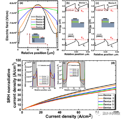 圖2 (a)各器件內(nèi)部橫向的電場(chǎng)分布,(b)Device 1和(c)Device 5邊緣區(qū)域量子阱中的能帶圖,(d)各器件的非輻射復(fù)合電流隨外加電流密度的變化曲線。其中Device 1/Ⅰ, 2/Ⅱ, 3/Ⅲ, 4/Ⅳ和5/Ⅴ的臺(tái)面傾斜角度分別為45°,53°,63°,79°和90°。