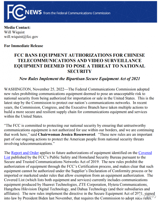 美國(guó)聯(lián)邦通訊委員會(huì)(Federal Communications Commission,F(xiàn)CC)以國(guó)家安全存在風(fēng)險(xiǎn)為由,11月25 日宣布禁止華為、中興通訊、海能達(dá)、海康威視、大華 5 家中國(guó)大陸公司的電信產(chǎn)品和視頻監(jiān)控設(shè)備,不得進(jìn)口至美國(guó)以及銷售。