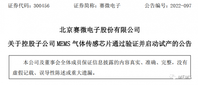 近日,北京賽微電子股份有限公司(以下簡稱“賽微電子”)控股子公司賽萊克斯微系統(tǒng)科技(北京)有限公司(簡稱“賽萊克斯北京”)代工制造的某款MEMS氣體傳感芯片通過了客戶驗(yàn)證,該客戶已同步簽署試產(chǎn)訂單,賽萊克斯北京啟動(dòng)首批MEMS氣體傳感芯片8英寸晶圓的小批量試生產(chǎn)。