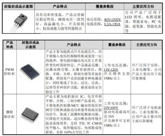 在功率器件方面,鍇威特產(chǎn)品以高壓平面 MOSFET 為主,并在平面 MOSFET 工藝平臺基礎(chǔ)上設(shè)計研發(fā)了集成快恢復高壓功率 MOSFET(FRMOS)系列產(chǎn)品;在功率 IC 方面,鍇威特產(chǎn)品主要包括 PWM 控制 IC 和柵極驅(qū)動 IC。此外,在第三代半導體方面,鍇威特的 SiC 功率器件已小批量出貨。
