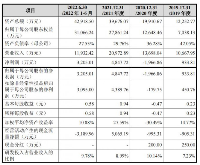 報告期內(nèi)(2019年、2020年、2021年、2022年1-6月),鍇威特營業(yè)收入分別為1.07億元、1.37億元、2.10億元、1.19億元,歸母凈利潤分別為933.81萬元、-1,966.86萬元、4,847.72萬元、3,205.01萬元。