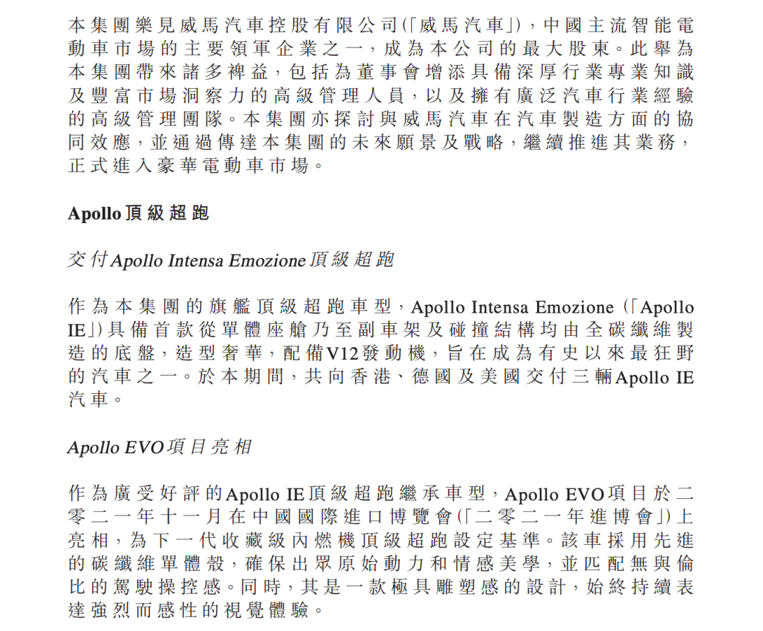 12月1日,Apollo智慧出行集團(tuán)發(fā)布截至9月30日的年度財(cái)務(wù)報(bào)告,董事長(zhǎng)何敬豐提到:“集團(tuán)于本期間在各項(xiàng)宏偉的項(xiàng)目上取得重大進(jìn)展,反映集團(tuán)在豪華電動(dòng)車市場(chǎng)發(fā)展的決心······以及與威馬汽車在汽車制造方面所產(chǎn)生的協(xié)同效應(yīng),進(jìn)一步發(fā)展其豪華電動(dòng)車業(yè)務(wù),從而構(gòu)建專注未來(lái)的豪華出行生態(tài)系統(tǒng)。”