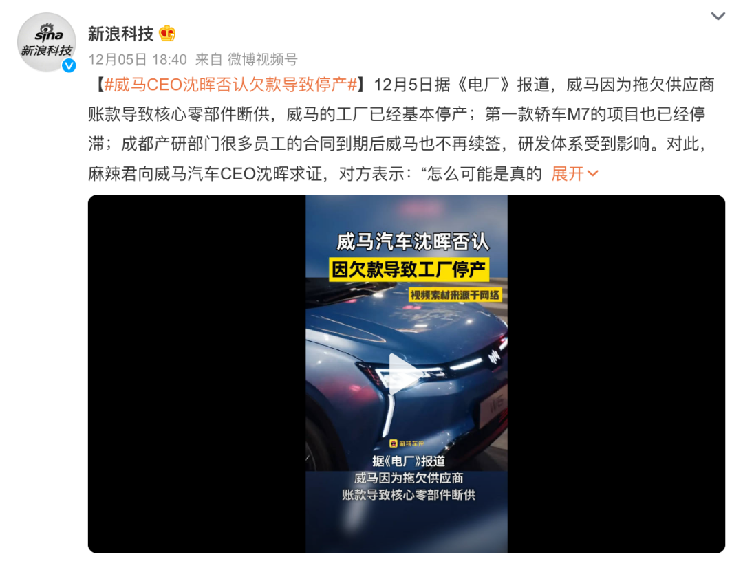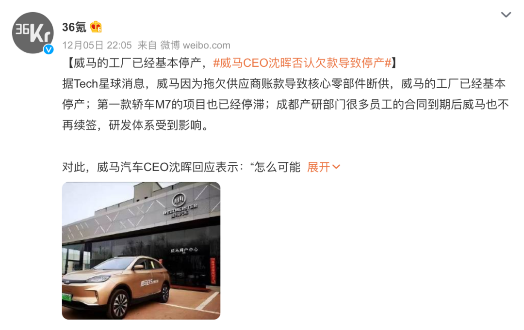 同日,一則“威馬欠款導(dǎo)致工廠停產(chǎn)”消息在網(wǎng)上引發(fā)熱議。報(bào)道稱,威馬因拖欠供應(yīng)商賬款導(dǎo)致核心零部件斷供,威馬工廠已經(jīng)基本停產(chǎn);第一款轎M的項(xiàng)目也已經(jīng)停滯;成都產(chǎn)研部門很多員工的合同到期后威馬也不再續(xù)簽,研發(fā)體系受到影響。針對(duì)此消息,威馬汽車創(chuàng)始人兼CEO沈暉回應(yīng)表示:“ 怎么可能是真的 ”。