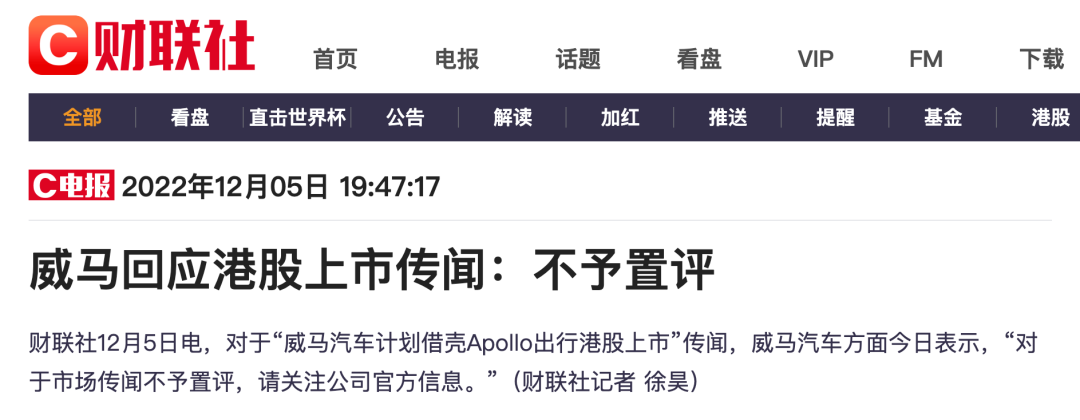 當(dāng)天,威馬汽車計(jì)劃通過(guò)借殼Apollo智慧出行集團(tuán)在港股上市的消息引發(fā)熱議。對(duì)此,威馬汽車相關(guān)負(fù)責(zé)人回應(yīng):“上述僅為市場(chǎng)傳聞,威馬對(duì)于市場(chǎng)傳聞不予置評(píng),還請(qǐng)關(guān)注公司官方回應(yīng),官方信息為正確信息。”