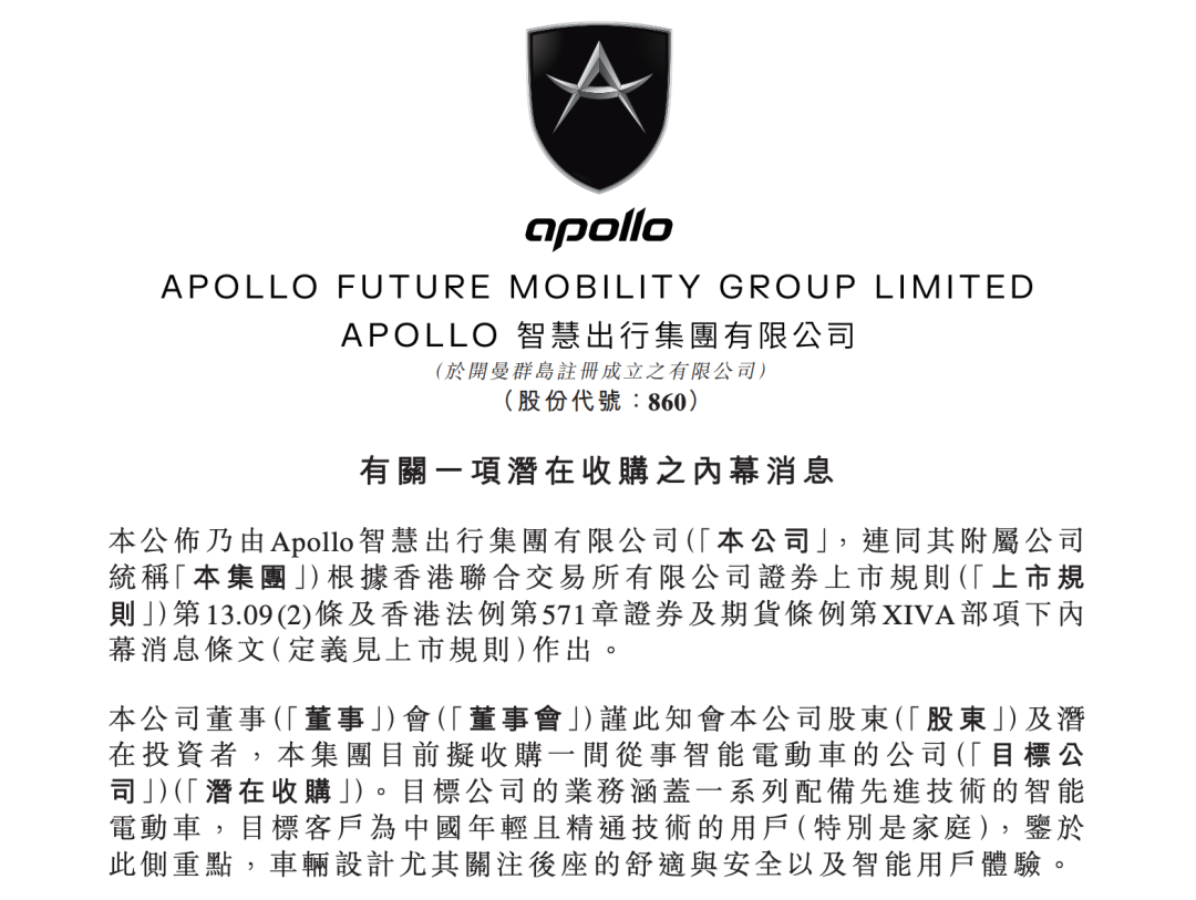 12月5日,港股上市公司Apollo智慧出行集團(tuán)發(fā)布公告顯示,公司擬收購(gòu)一間從事智能電動(dòng)車的公司,目標(biāo)公司的業(yè)務(wù)涵蓋一系列配備先進(jìn)技術(shù)的智能電動(dòng)車,目標(biāo)客戶為中國(guó)年輕且精通技術(shù)的用戶(特別是家庭)。目前,潛在收購(gòu)仍在磋商中,尚未就潛在收購(gòu)訂立最終協(xié)議。