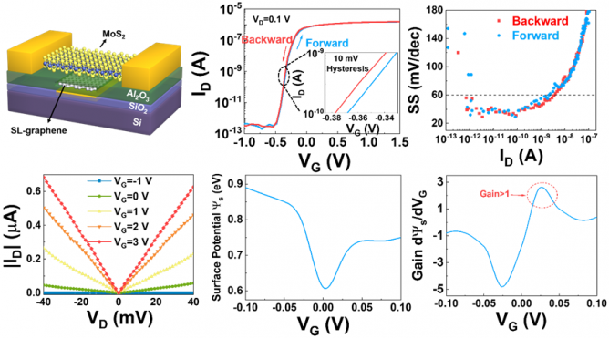 該工作將單層石墨烯二維金屬系統(tǒng)集成于MoS2晶體管的柵極結(jié)構(gòu)中,構(gòu)建負量子電容晶體管(NQCFET)器件,利用單層石墨烯在低態(tài)密度條件下產(chǎn)生的負電子壓縮效應(yīng),通過柵極電壓調(diào)控形成負量子電容。類似于傳統(tǒng)基于鐵電材料的負電容器件,NQCFET器件中利用石墨烯提供的負量子電容貢獻,實現(xiàn)內(nèi)部柵壓放大和小于60mV/dec亞閾值擺幅的特性。該工作中,通過對器件柵極疊層結(jié)構(gòu)以及制備工藝的優(yōu)化,實現(xiàn)了最小31mV/dec的亞閾值擺幅和可忽略的滯回特性,以及超過106的開關(guān)比,有效降低器件靜態(tài)與動態(tài)功耗。同時結(jié)合理論仿真揭示了器件陡峭亞閾值擺幅的形成機理,為未來高速低功耗晶體管器件技術(shù)的發(fā)展提供了新的路徑。