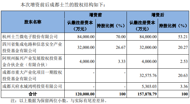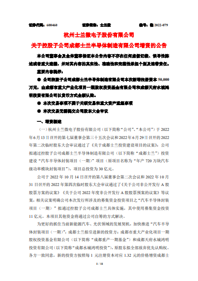 為更好的抓住當(dāng)前新能源汽車、光伏領(lǐng)域的發(fā)展契機(jī),加快推進(jìn)“汽車半導(dǎo)體封裝項(xiàng)目(一期)”,成都士蘭擬引進(jìn)新的投資方:成都市重大產(chǎn)業(yè)化項(xiàng)目一期股權(quán)投資基金有限公司和成都天府水城鴻明投資有限公司,原股東擬全部放棄優(yōu)先認(rèn)購權(quán)。其中,成都重產(chǎn)一期基金以貨幣方式增資4.3億元;成都水城鴻明投資以貨幣方式增資7000萬元。
