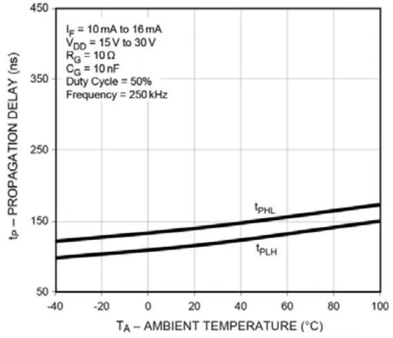 穩(wěn)定LED、溫度補(bǔ)償放大器和電流源,傳播延遲在-40℃至100℃間的變化通常是+0.2 ns /℃,如圖6所示。