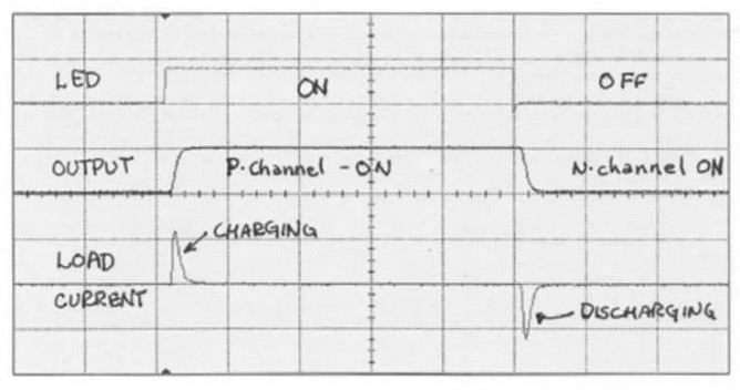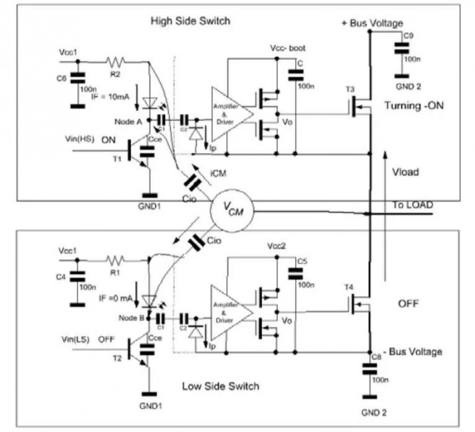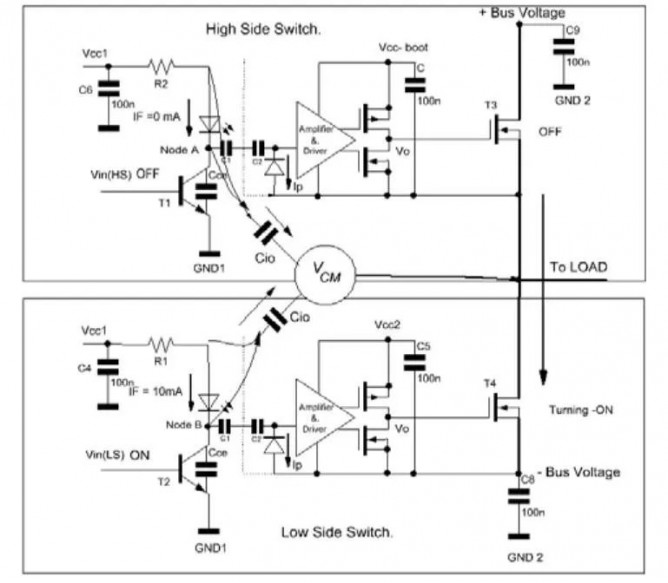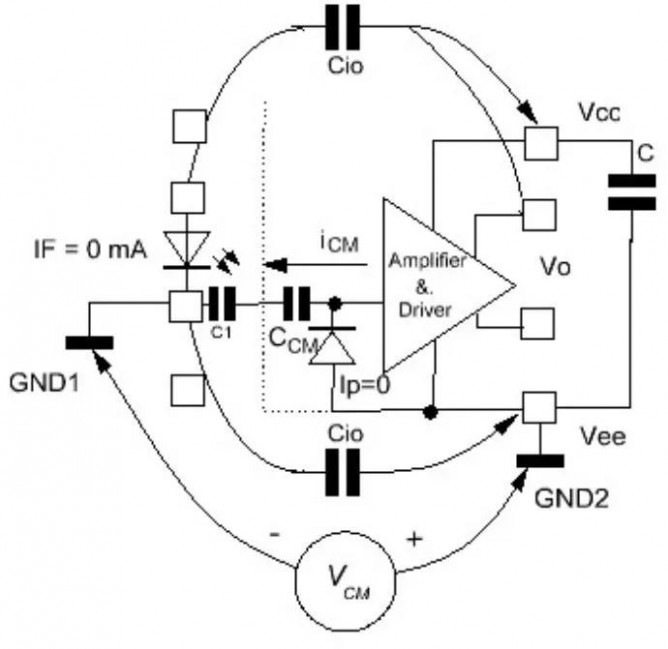 2)通過封裝電容耦合的負(fù)載dv / dt ,被耦合至低阻抗(要么導(dǎo)通LED ,要么導(dǎo)通BJT或邏輯門的導(dǎo)通電阻)中。