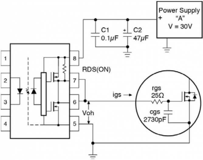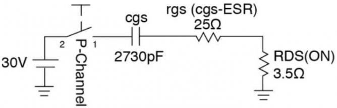圖12顯示的是,F(xiàn)OD3120和N溝道功率MOSFET之匯作間的互連。圖13提供了用于計算FOD3120輸出功率的力器等效電路。P溝道晶體管建模為帶有3.5Ω的串聯(lián)電阻的開關(guān)。FQA9N90C_F109的輸入建模為串聯(lián) RC 電路。電路元件是柵極至源極電容2730 pF 、與25Ω等效力率串聯(lián)電阻(ESR)串聯(lián)。