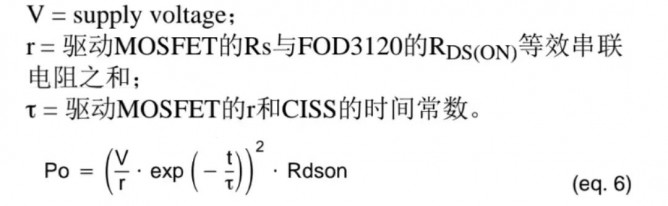 FOD3120的MOSFET峰值功耗由峰值電流和指數(shù)的延遲時間(t)確定,其中: