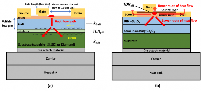 圖1:幾種典型的寬禁帶器件結(jié)構(gòu):(a) 氮化鎵高電子遷移率晶體管(GaN HEMT); (b) 氧化鎵場效應(yīng)管(β-Ga2O3 FET); 以上典型結(jié)構(gòu)說明器件內(nèi)存在大量微納結(jié)構(gòu)和異質(zhì)界面
