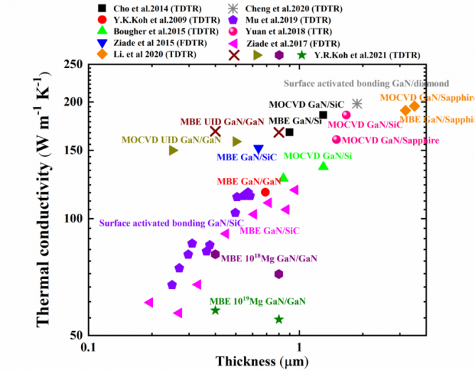 圖2:氮化鎵薄膜的熱導(dǎo)率報道值;全文中還詳細(xì)總結(jié)了氮化鎵異質(zhì)結(jié)構(gòu)、氧化鎵異質(zhì)結(jié)構(gòu)、金剛石薄膜和寬禁帶合金材料的熱物性報道值(熱導(dǎo)率、界面熱阻)
