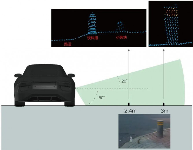 此外,為了達(dá)到上述的小物體分辨能力,除了足夠的角分辨率外,測(cè)距的精準(zhǔn)度也是關(guān)鍵。測(cè)距精度不高,將無法形成較為清晰的點(diǎn)云輪廓,也無法對(duì)上述細(xì)微坡度進(jìn)行精準(zhǔn)探測(cè)。更多的探測(cè)場(chǎng)景如下圖所示: