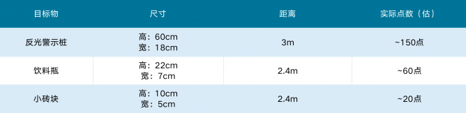 上圖是ML-30s在典型場(chǎng)景的測(cè)試結(jié)果,可以清晰地分辨出飲料瓶、小磚塊和遠(yuǎn)處的路樁。更重要的是,從點(diǎn)云圖中還能清晰地分辨出路沿的坡度變化。