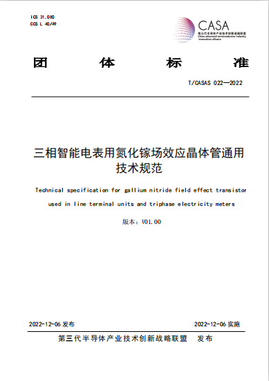 由深圳智芯微電子科技有限公司牽頭制定,遵循CASAS(第三代半導體產(chǎn)業(yè)技術戰(zhàn)略聯(lián)盟)標準制定流程,經(jīng)過標準起草小組會議討論、廣泛征求意見、委員會草案投票等流程,團體標準T/CASAS 022—2022《三相智能電表用氮化鎵場效應晶體管通用技術規(guī)范》于2022年12月9日正式面向產(chǎn)業(yè)發(fā)布。