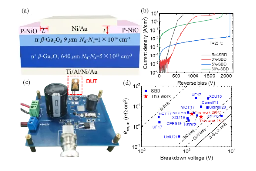 圖1結終端擴展氧化鎵肖特基二極管。(a)器件結構示意圖。(b)具有不同JTE區(qū)域電荷濃度的器件擊穿特性比較。(c)封裝器件反向恢復特性測試電路。(d)與已報道的氧化鎵肖特基二極管的性能比較。