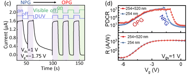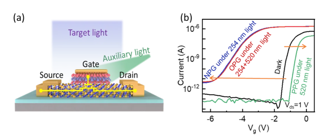光電探測器在目標跟蹤、環(huán)境監(jiān)測、光通信、深空探索等諸多領域發(fā)揮著越來越重要的作用。響應度和響應速度是光電探測器的兩個關鍵的性能參數(shù),然而這兩個指標之間存在著制約關系,此消彼長。由于缺乏成熟的材料缺陷控制技術,該問題在以氧化鎵材料為代表的超寬禁帶半導體探測器中尤為突出。龍世兵教授團隊通過引入額外的輔助光源實現(xiàn)對向光柵(OPG)調控方案(圖2a),來緩解上述制約關系。該OPG方案下的Ga2O3/WSe2結型場效應晶體管探測器在目標光(深紫外)照射下表現(xiàn)出負向光柵效應(NPG),器件的閾值電壓往負向移動(圖2b);與之相反,輔助光源(可見光)照射使器件表現(xiàn)出正向光柵效應(PPG),器件的閾值電壓往正向移動;在目標光及輔助光同時照射下,器件整合了正、負對向光柵效應,但總體表現(xiàn)為閾值電壓朝負向移動。OPG方案有效抑制器件內嚴重的持續(xù)光電導效應,器件的響應速度明顯提升(圖2c)。此外,如圖(2d)所示,OPG調控方案中引入的輔助性可見光對器件的光/暗電流比和響應度等關鍵指標幾乎不產生影響。最終,當OPG方案中的可見光常開,在僅犧牲10.4 %的響應度的情況下即實現(xiàn)了>1200倍響應速度的提升,成功削弱了響應度和響應速度之間的制約關系。特別地,當通過反饋電路控制輔助光源僅在器件響應的下降沿觸發(fā),將在無響應度犧牲的情況下實現(xiàn)響應速度的數(shù)量級提升。該工作提出了一種光電探測器芯片內千萬像素共享一顆輔助LED即可緩解響應度與響應速度之間的制約關系的策略,對光電探測芯片綜合性能的提升有重要的參考意義。研究成果以“Alleviating the Responsivity-Speed Dilemma of Photodetectors via Opposite Photogating Engineering with an Auxiliary Light Source beyond the Chip”為題發(fā)表在IEDM 2022上。我校微電子學院龍世兵教授和趙曉龍?zhí)厝胃毖芯繂T為論文的共同通訊作者,微電子學院博士生鄒燕妮為論文第一作者,碩士生曾妍和博士生譚鵬舉為論文的共同第一作者。