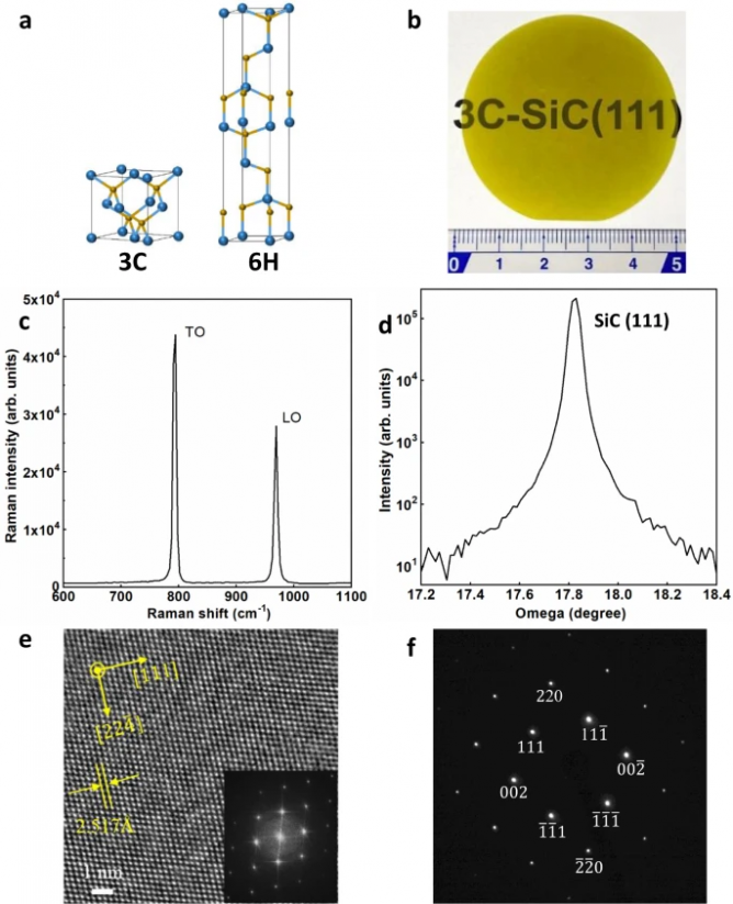 a )3C-SiC 和6H-SiC的原子結(jié)構(gòu);b) 3C-SiC 2 英寸晶圓的圖片,尺子的單位是厘米;c)3C-SiC 晶體的拉曼光譜;d )3C-SiC 的X射線衍射(XRD);e區(qū)域軸拍攝的3C-SiC的高分辨率STEM圖像。插圖:STEM圖像的快速傅立葉變換(FFT);f區(qū)域軸上拍攝的3C-SiC的選定區(qū)域電子衍射圖案。