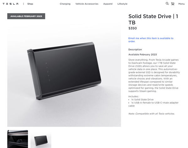 這款固態(tài)硬盤將在2023年2月上市,售價為350美元(約合人民幣2436元),除去硬盤本身,還將附帶一根USB-A to USB-C數(shù)據(jù)線,支持所有特斯拉汽車。
