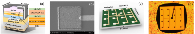圖(a)硅基垂直結(jié)構(gòu)氮化鎵Micro-LED示意圖;(b)50 μm芯片的SEM圖;(c)4×4芯片陣列示意圖;(d)50 μm芯片陣列的光學(xué)顯微圖像
