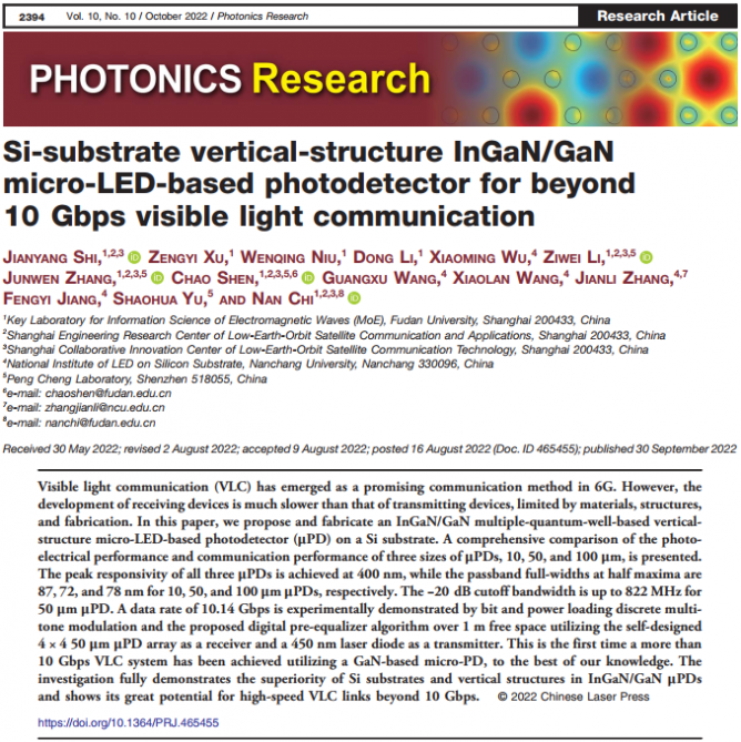 為解決上述問題,復(fù)旦大學(xué)遲楠教授、沈超教授、施劍陽(yáng)博士研究團(tuán)隊(duì)聯(lián)合南昌大學(xué)、國(guó)家硅基LED工程技術(shù)研究中心江風(fēng)益院士、張建立教授等人設(shè)計(jì)了一種硅基垂直結(jié)構(gòu)的氮化鎵Micro-LED。將該LED作為探測(cè)器,成功實(shí)現(xiàn)了10 Gbps的可見光通信。相關(guān)研究成果發(fā)表于Photonics Research 2022年第10期。