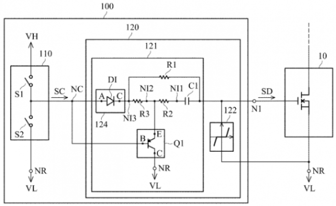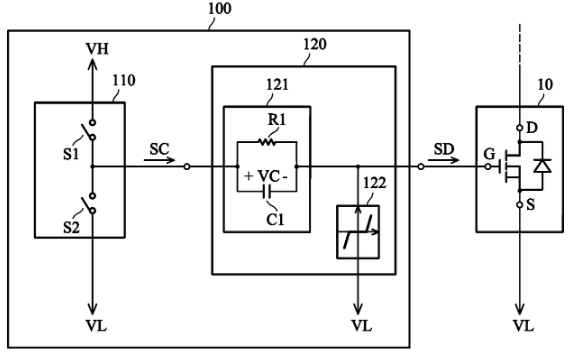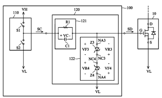 如圖中所示,該專利族解決上述問題的基礎方案包括:(1)采用了RC電路121與高壓VH、低壓VL電源配合產生正負驅動電壓,(2)在柵極端加入了電壓鉗位電路122。