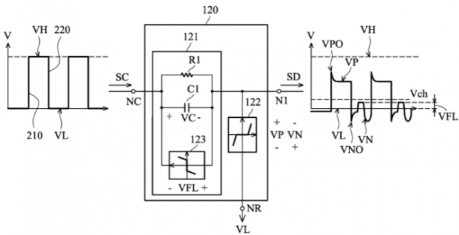 該技術點是美國專利US10826484B2所保護的重點,其主要采用了如下圖中所示的波形轉換電路120,其中加入了隔離單向導電器件124以及一個PNP晶體管Q1。隔離單向導電裝置 124 單向提供高電平VH,而 PNP晶體管Q1則是在控制器提供低電平VH時被導通,使得電容C1能夠通過電阻R放電至低電平VL2。