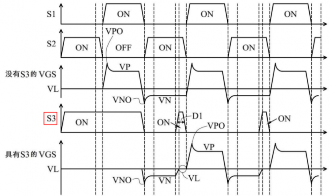 另外,專利中還給出如下圖所示的另一種控制開關S3的方案,除了在驅動電路啟動的時間之外,開關S3在每次S2導通之后且S1導通之前的階段會被導通,使得晶體管的VGS電壓從負電壓恢復到低電平VL的狀態(tài),且S3的導通時長可以被設計得比下圖中的更長(專利說明書中附圖5的補充方案)。雖然專利中未明確該方案的作用,但從其波形圖中可知,這樣控制一方面能降低晶體管導通瞬間的電壓變化率dv/dt,另一方面如果開關S3每次導通周期更長,則能降低驅動電路的功率損耗。