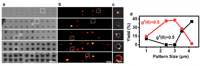 圖1.制備得到的不同尺寸缺陷結(jié)構(gòu)陣列(a)及相應(yīng)的光致發(fā)光圖像(b)(c)。(d)為統(tǒng)計(jì)得到的不同尺寸下單光子源產(chǎn)率