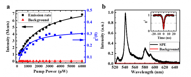 圖2. (a)制作出最高亮度單光子源的光子發(fā)射速率跟泵浦功率關(guān)系。(b)一個(gè)典型單光子源的發(fā)光峰及其二階關(guān)聯(lián)函數(shù)(插圖)