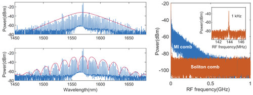 圖1 SiC光學(xué)頻率梳頻譜、噪聲譜及其拍頻譜