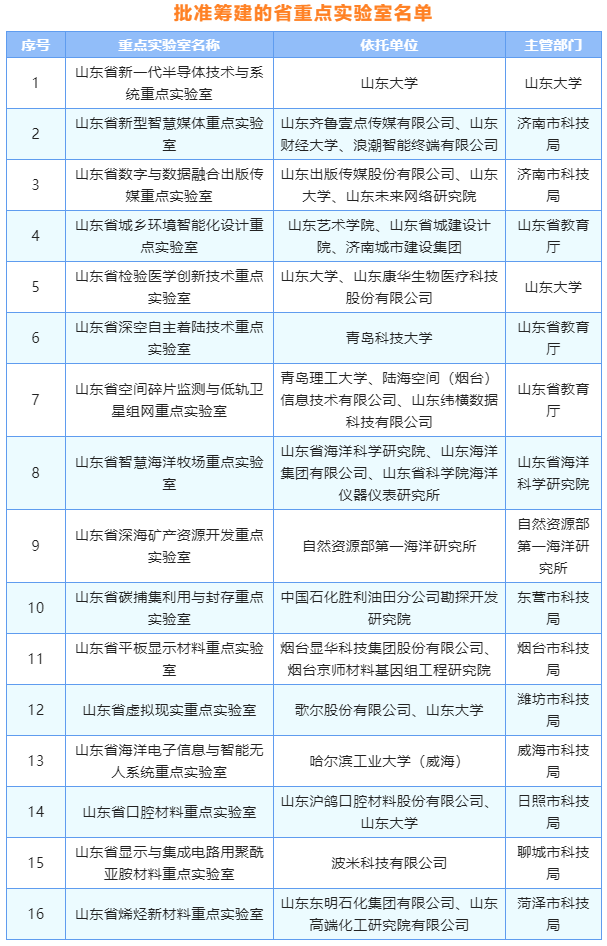 為深入貫徹黨的二十大精神,完善科技創(chuàng)新體系,加快創(chuàng)新型省份建設(shè),根據(jù)《山東省實(shí)驗(yàn)室體系建設(shè)規(guī)劃(2020-2025年)》(魯科字〔2020〕110號(hào))《山東省重點(diǎn)實(shí)驗(yàn)室建設(shè)實(shí)施方案》(魯科字〔2020〕113號(hào))《山東省重點(diǎn)實(shí)驗(yàn)室管理辦法》(魯科字〔2018〕72號(hào))等有關(guān)規(guī)定,經(jīng)研究同意,批準(zhǔn)建設(shè)山東省新一代半導(dǎo)體技術(shù)與系統(tǒng)等16家重點(diǎn)實(shí)驗(yàn)室?,F(xiàn)將有關(guān)事項(xiàng)通知如下: