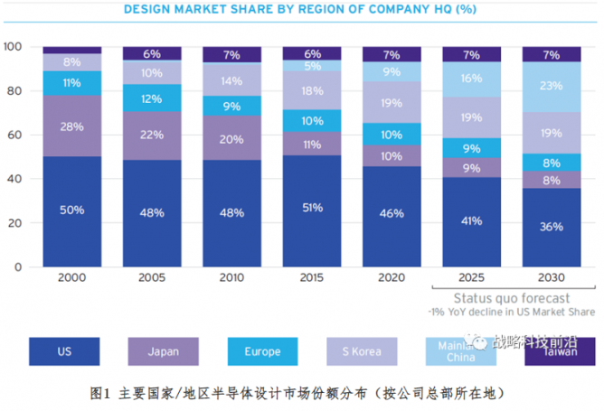 圖1 主要國家/地區(qū)半導(dǎo)體設(shè)計市場份額分布(按公司總部所在地)