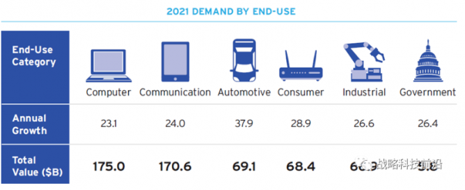 半導(dǎo)體終端應(yīng)用驅(qū)動因素反映了新冠疫情需求沖擊下的變化。2021年,幾乎所有類別的半導(dǎo)體終端應(yīng)用銷售都出現(xiàn)了顯著增長。隨著越來越多的工作方式轉(zhuǎn)移為遠(yuǎn)程工作和在線教育,電腦等終端應(yīng)用類別的銷售額出現(xiàn)了顯著增長。其他市場,如汽車市場全年經(jīng)歷了大幅增長,最終成為半導(dǎo)體的第三大終端應(yīng)用市場,見圖2。如前所述,2021年全球芯片銷售額達(dá)到5559億美元,銷量為1.15萬億,其中增長最快的是能夠承受高溫和其它物理挑戰(zhàn)的汽車級芯片。