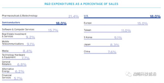 圖3 美國各行業(yè)研發(fā)占比(研發(fā)支出占銷售額的百分比)及主要國家/地區(qū)半導(dǎo)體行業(yè)研發(fā)占比