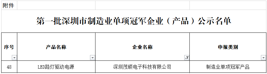 近日,深圳市工業(yè)和信息化局公示第一批深圳市制造業(yè)單項冠軍企業(yè)(產(chǎn)品)名單,茂碩電源科技股份有限公司(簡稱:茂碩電源,股票代碼:002660)旗下全資子公司——深圳茂碩電子科技有限公司LED路燈驅(qū)動電源榮獲“制造業(yè)單項冠軍產(chǎn)品”稱號!