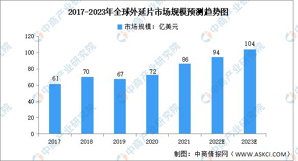 全球外延片市場規(guī)模受下游半導(dǎo)體行業(yè)影響較大,5G技術(shù)的應(yīng)用、人工智能的發(fā)展促進(jìn)了消費(fèi)電子需求量的增長,半導(dǎo)體需求反彈,全球外延片市場規(guī)模增長顯著。數(shù)據(jù)顯示,2017-2021年全球外延片行業(yè)市場規(guī)模總體呈增長趨勢(shì),由2017年的61億美元增長至2021年的86億美元,復(fù)合年均增長率達(dá)9.0%,預(yù)計(jì)2023年將達(dá)104億美元。