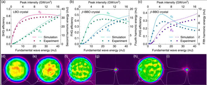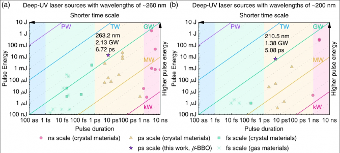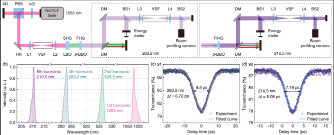 在這項工作中,研究人員基于1 μm波段激光的高效四次諧波和五次諧波產(chǎn)生,同時展示了260和210 nm兩個波段的高峰值功率皮秒深紫外激光源。在263.2和210.5 nm均實現(xiàn)了超過GW水平的峰值功率輸出,峰值功率最高分別達到2.13 GW和1.38 GW,轉(zhuǎn)換效率分別達到42.9%和28.8%。同時,基于這一深紫外光源,研究人員還系統(tǒng)地表征了典型雙折射和非線性硼酸鹽晶體(包括α-BBO、β-BBO、LBO和CLBO)的深紫外光學(xué)性質(zhì)。實驗結(jié)果從三方面分別代表了目前ps重頻深紫激光最高輸出峰值功率、最高轉(zhuǎn)換效率、及最綜合的硼酸鹽晶體深紫外光學(xué)特性表征。本項工作將有助于進一步實現(xiàn)超高峰值功率深紫外及真空紫外激光光源的產(chǎn)生,并在科學(xué)和工業(yè)領(lǐng)域中發(fā)揮關(guān)鍵應(yīng)用。
