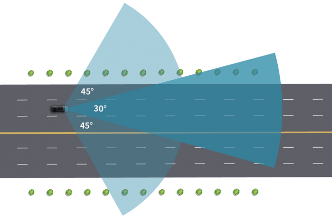 兩側(cè)視場(chǎng)(-60°~-15°和15°~60°)探測(cè)距離為100m@10%反射率,保證在城市工況下大角度的感知探測(cè)。