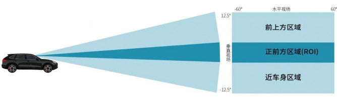 近車身區(qū)域:指的是激光雷達(dá)垂直視場(chǎng)向下的部分,一般來說這部分視場(chǎng)覆蓋的是車前方的近距離區(qū)域(70米范圍內(nèi))。此區(qū)域?qū)欠直媛室蟛桓撸灰軡M足中短距的成像要求即可。