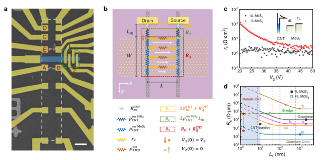 最近清華大學物理系低維量子物理國家重點實驗室博士生李炫璋同學在導師范守善院士和魏洋副研究員、張躍鋼教授的指導下,提出并發(fā)展了二維半導體的一維半金屬接觸。他們將兩根平行排列且具有相同手性的半金屬單壁碳納米管用于二維半導體的接觸電極,從實驗上實現(xiàn)了具有亞 2 納米接觸長度的場效應晶體管器件。這種混合維度半金屬半導體接觸相比二維異質(zhì)結(jié)更為緊密,并且可以在外部電場的調(diào)控下實現(xiàn)肖特基接觸和歐姆接觸之間的切換。發(fā)展了縱向傳輸線模型,實現(xiàn)了短接觸極限下的低維場效應晶體管各項電學參數(shù)的定量評估?;谠撃P吞崛〉玫揭痪S二維界面接觸電阻率和接觸電阻在歐姆接觸模式下分別可低至10-6 Ω·cm2和50 kΩ·μm,這在二維半導體的超短接觸中處于領(lǐng)先水平。進一步證明了一維半金屬接觸的獨特能帶結(jié)構(gòu)使其功函數(shù)大范圍可調(diào),從而可以匹配具有不同帶邊位置的半導體,可用做MoS2,WS2,WSe2等材料的通用電極。該工作為未來集成電路元器件尺寸的進一步微縮提供了新的發(fā)展思路和重要方法。